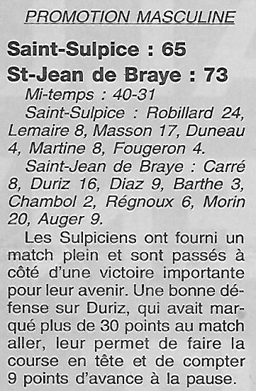 Saison 2000-2001 : En Championnat de Promotion d’Excellence Masculine A lors de la Journée du 11 Mars 2001, l’ABC St Jean de Braye bat Saint-Sulpice