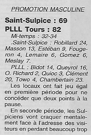 Saison 2000-2001 : En Championnat de Promotion d’Excellence Régionale Masculine A, lors de la Journée du 25 Mars 2001, PLLL Tours bat Saint-Sulpice