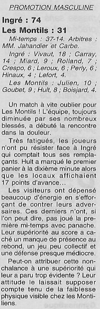 Saison 2000-2001 : En Championnat de Promotion d’Excellence Régionale Masculine B, lors de la Journée du 25 Mars 2001 Ingré bat Les Montils