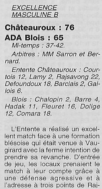 Saison 2000-2001 : En Championnat d’Excellence Régionale Masculine B, lors de la Journée du 25 Mars 2001, l’Entente de Châteauroux bat l’ADA Blois