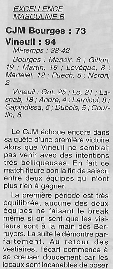 Saison 2000-2001 : En Championnat d’Excellence Régionale Masculine B, lors de la Journée du 29 Avril 2001, Vineuil bat le CJM Bourges