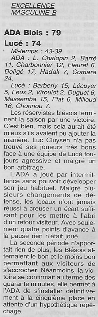 Saison 2000-2001 : En Championnat d’Excellence Régionale Masculine B, lors de la Journée du 6 Mai 2001, l’ADA Blois bat Lucé