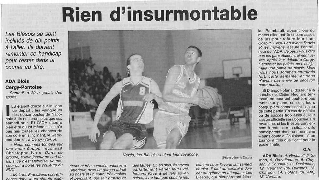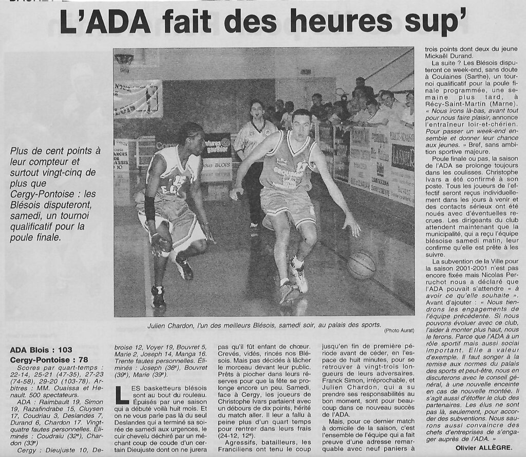 Saison 2000-2001 : En Match retour de Barrage de Nationale Masculine 3, l’ADA Blois bat Cergy-Pontoise et se Qualifie pour le Tour suivant