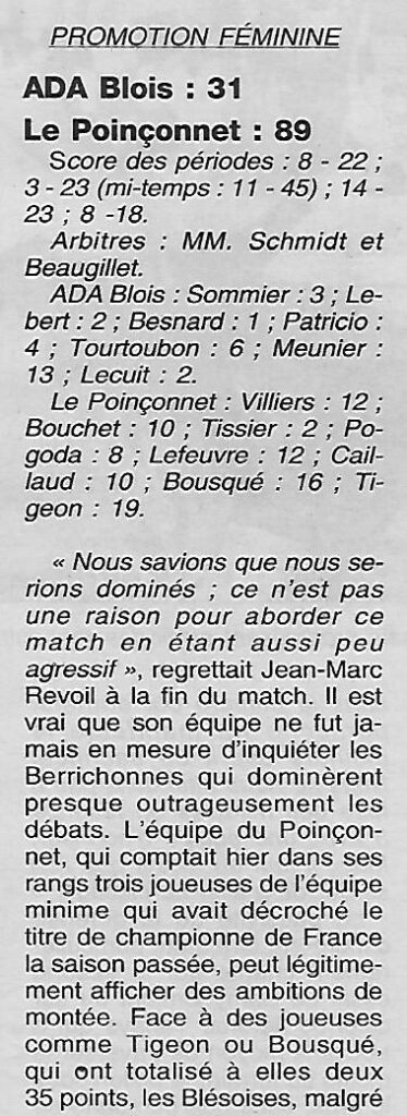 Saison 2001-2002 : En Championnat de Promotion d’Excellence Régionale Féminine A, lors de la 5ème Journée, Le Poinçonnet bat l’ADA Blois