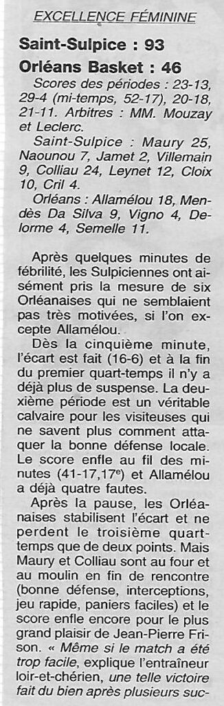 Saison 2001-2002 : En Championnat d’Excellence Régionale Féminine, lors de la 5ème Journée, Saint-Sulpice bat Orléans-Basket