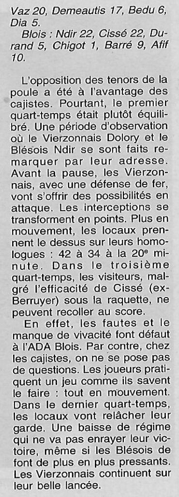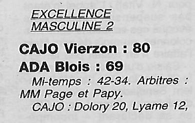 Saison 2001-2002 : En Championnat d’Excellence Régionale Masculine 2 A, lors de la 5ème Journée, le CAJO Vierzon bat l’ADA Blois