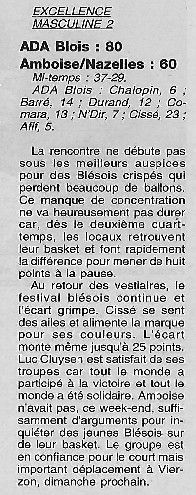 Saison 2001-2002 : En Championnat d’Excellence Régionale Masculine 2 A, lors la 9ème Journée, l’ADA Blois bat Amboise-Nazelles