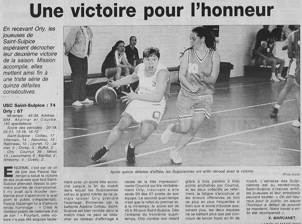 Saison 2002-2003 : En Championnat de Nationale Féminine 3, Saint-Sulpice tient sa Victoire face à Orly