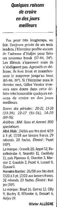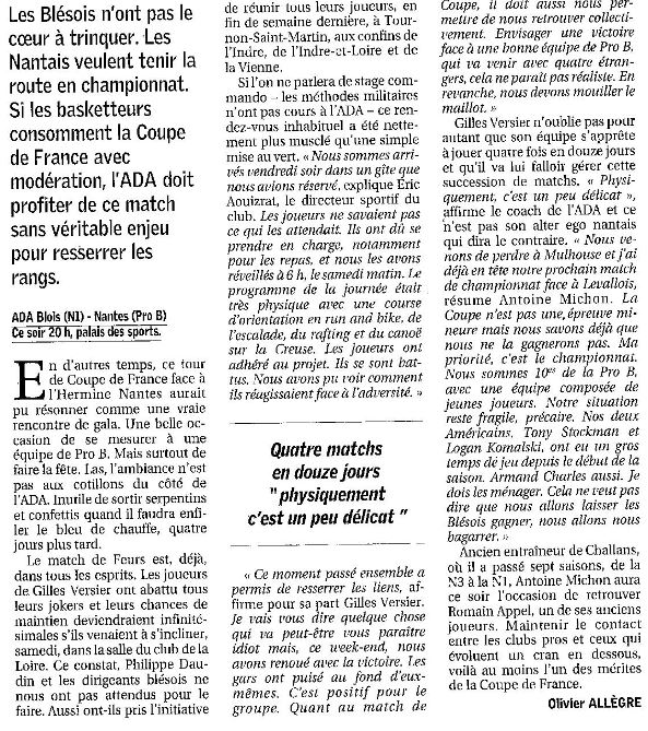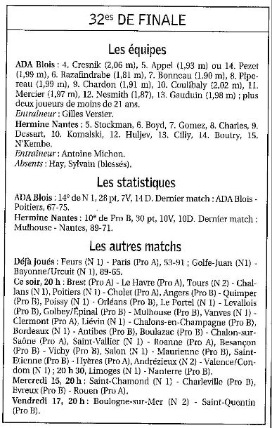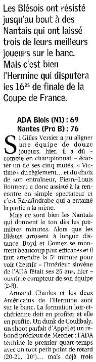 Saison 2005-2006 : En 32ème de Finale de la Coupe de France, Nantes (PRO B) bat l’ADA Blois (NM1)