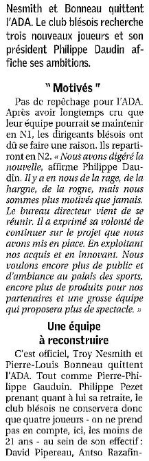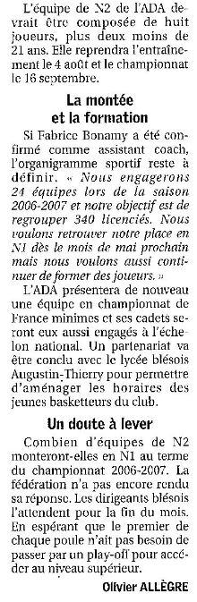 Saison 2005-2006 : L’ADA Blois repartira en Championnat de Nationale Masculine 2