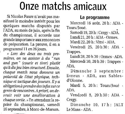 Saison 2006-2007 : Calendrier des Matchs Amicaux de l’ADA Blois