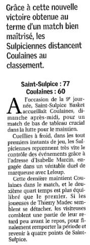 Saison 2006-2007 : En Championnat de Nationale Féminine 3, lors de la Journée du 26 Novembre 2006, Saint-Sulpice bat Coulaines