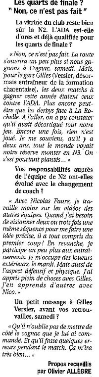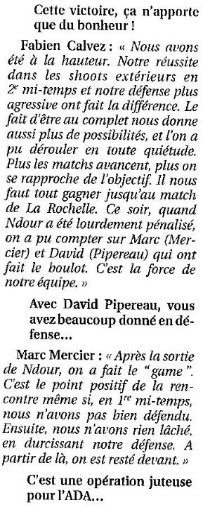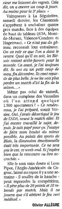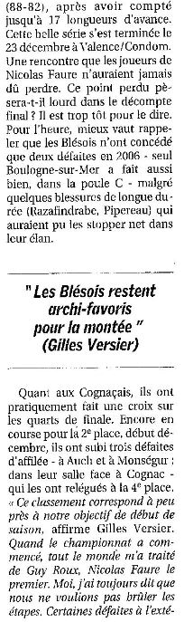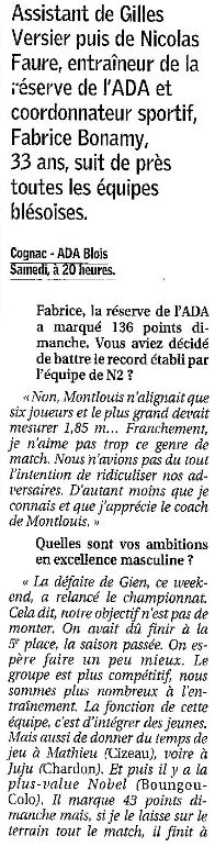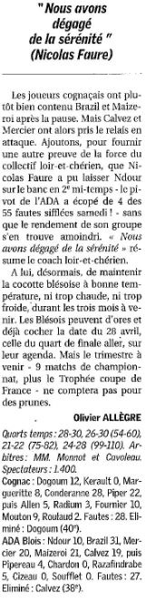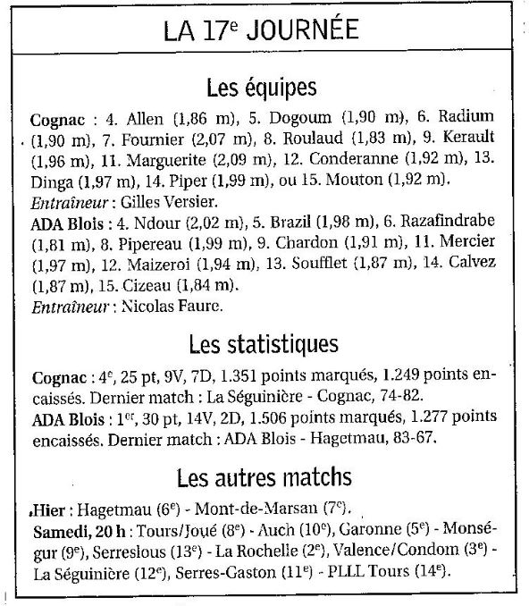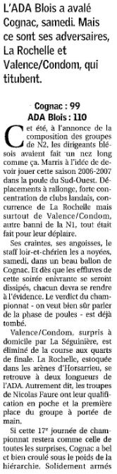 Saison 2006-2007 : En Championnat de Nationale Masculine 2, lors de la Journée du 20 Janvier 2007, l’ADA Blois Bat Cognac