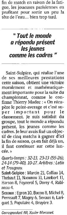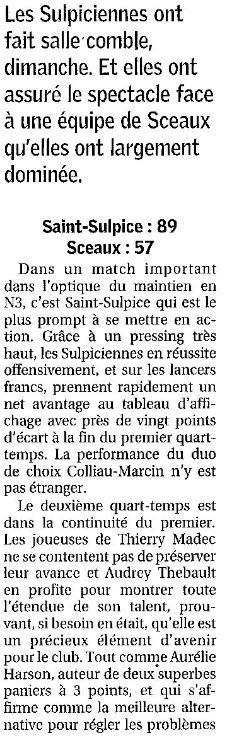 Saison 2006-2007 : En Championnat de Nationale Féminine 3, lors de la Journée du 21 Janvier 2007, Saint-Sulpice bat Sceaux