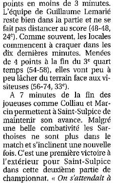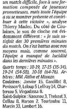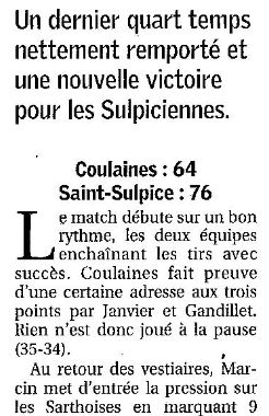 Saison 2006-2007 : En Championnat de Nationale Féminine 3, lors de la Journée du 1er Avril 2007, Saint-Sulpice bat Coulaines