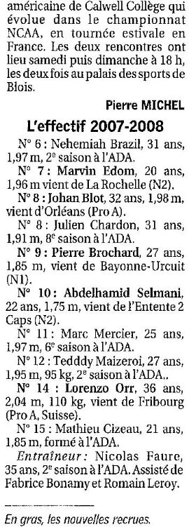 Saison 2007-2008 : L’effectif de l’ADA Blois est complet