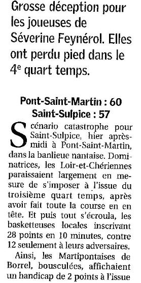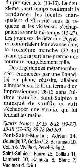 Saison 2007-2008 : En Championnat de Nationale Féminine 3, lors de la Journée du 4 Novembre 2007, Pont Saint Martin bat Saint-Sulpice